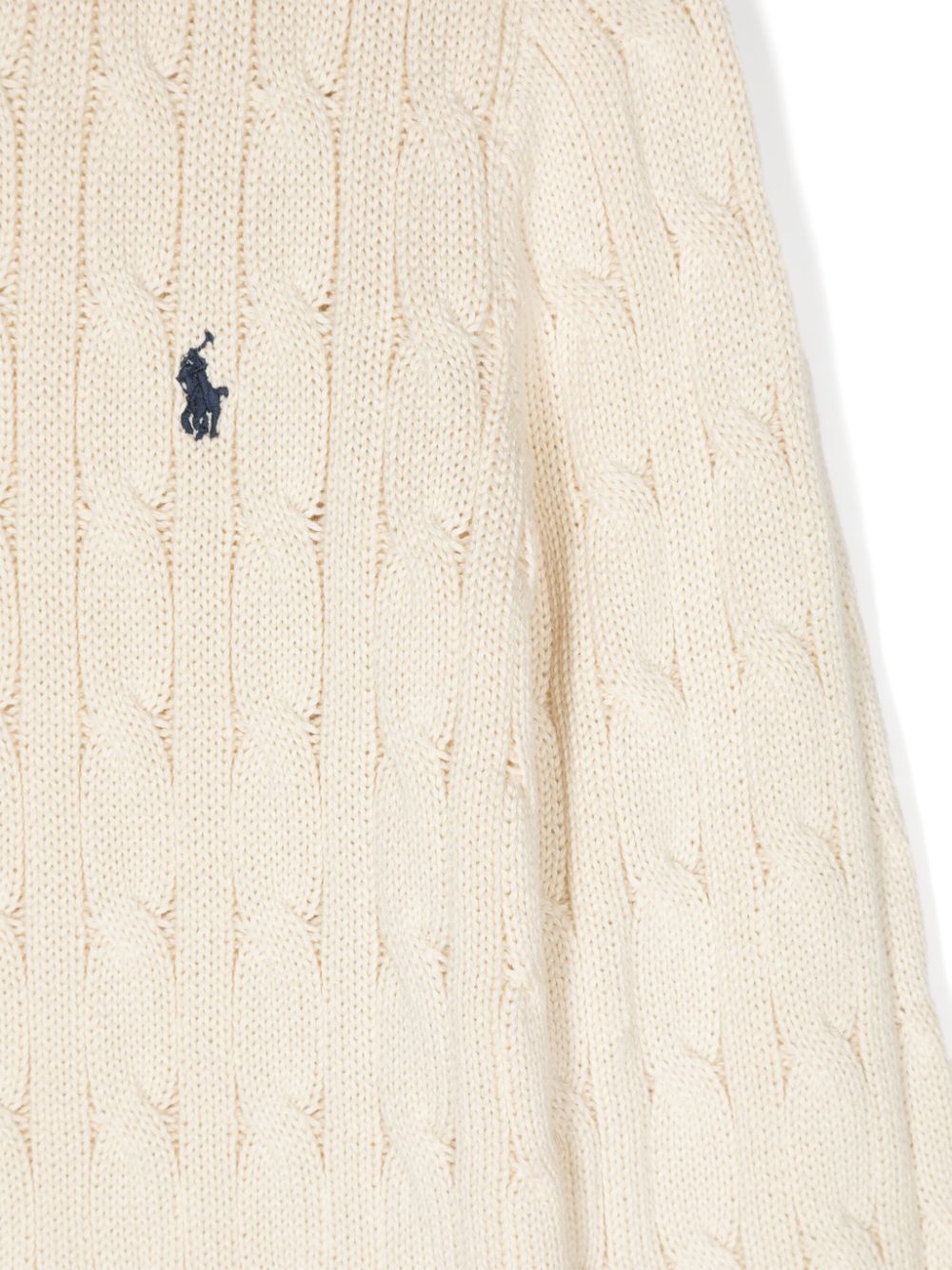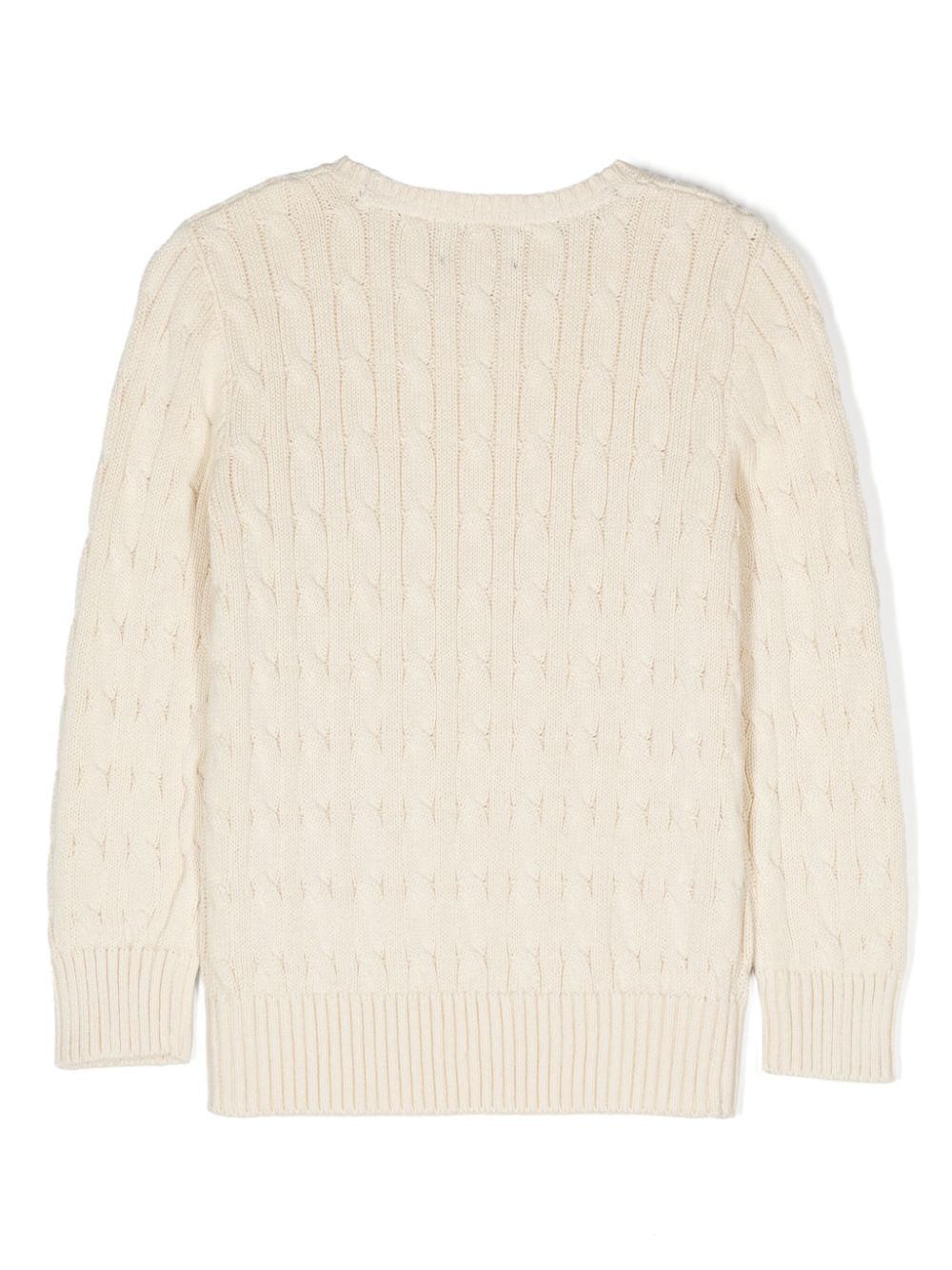 cream white cotton cable knit signature Polo Pony motif crew neck long sleeves ribbed cuffs and hem